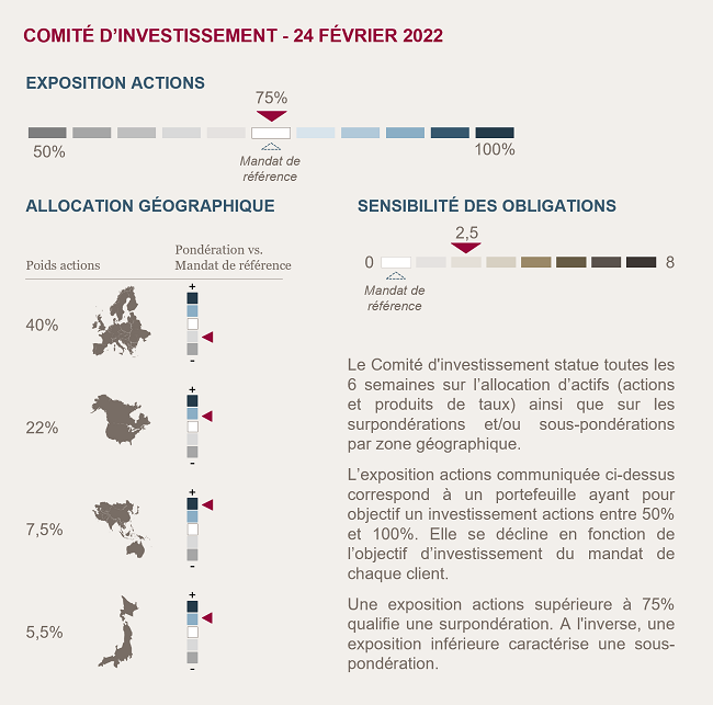 En termes d’allocation d’actifs, si le risque géopolitique semble en grande partie intégré à ce stade, nous actons les niveaux d’exposition actions au point « neutre » et nous ne considérons pas la baisse actuelle comme une opportunité pour augmenter le niveau de risque dans les portefeuilles. Cette analyse est bien entendu réalisée sous l’hypothèse d’une escalade limitée du conflit avec l’Otan.
